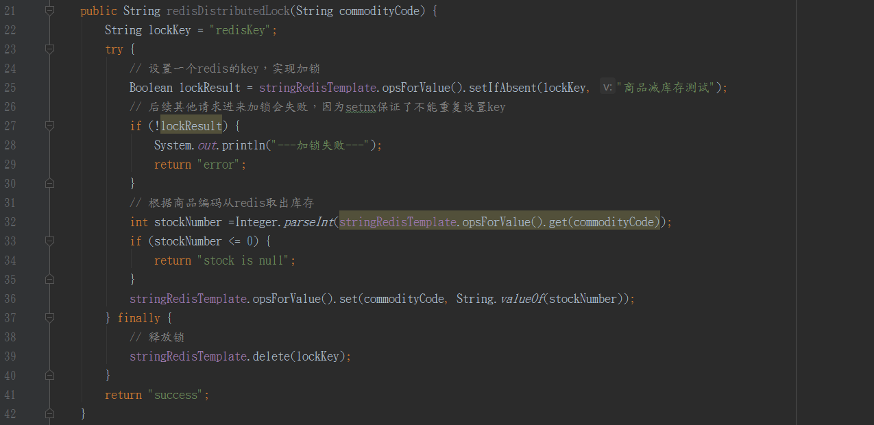设置成功了会返回true,设置不成功(已经有这个key了)会返回false,使用代码实现如下(java里面的setIfAbsent对应的就是redis的setnx),一个分布式锁就实现了