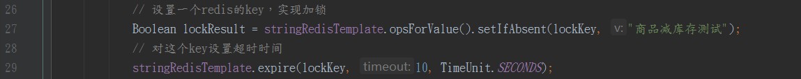 但是这样又有问题,就是如果在执行完27行代码想要继续执行29行的时候,应用的服务器挂了,还没来得及设置超时时间,那岂不是又要会死锁?所以需要把27行设置锁代码和29行设置时间的代码保证一个原子性,