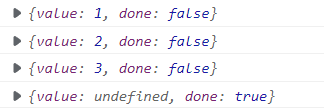 使用 .next() 进行遍历,返回一个对象,value表示值,如果没有会返回 undefined;done表示下面是否还有可遍历内容,有返回false,没有返回true。
