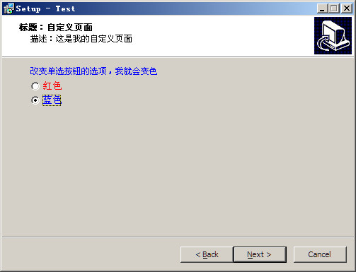 该段代码中重点是单选按钮的OnClick事件,该属性所指向的过程决定了单选按钮被点击后的行为,安装文件运行到自定义页面后效果如下: