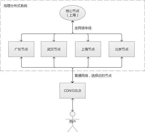 当一个系统和服务足够大的时候,就必须开始考虑异地部署的问题了。让你的服务,尽可能离用户更近。我们前面已经提到了Web的静态资源,可以存放在CDN上,然后通过DNS/GSLB的方式,让静态资源的分散“全国各地”。但是,CDN只解决的静态资源的问题,没有解决后端庞大的系统服务还只集中在某个固定城市的问题。