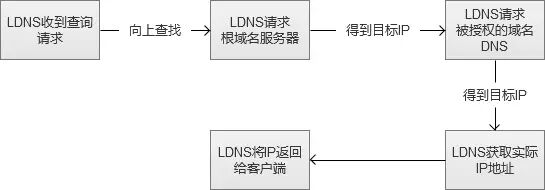 图中的“向上寻找”,实际过程是LDNS(Local DNS)先向根域名服务(Root Name Server)获取到顶级根的Name Server(例如.com的),然后得到指定域名的授权DNS,然后再获得实际服务器IP。