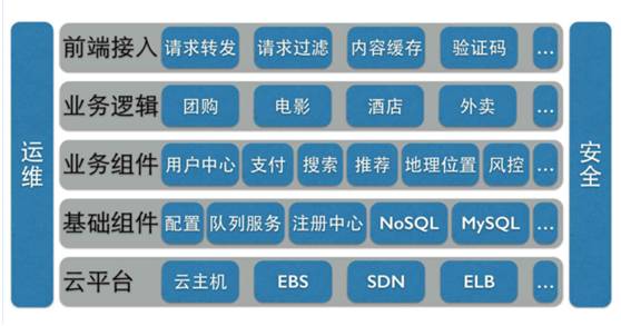 比如说为了做用户访问性能的优化,我们会做大量的各种各样内容的缓存,包括CDN也好,包括我们内部不同层次之间,包括一些验证码的服务。所以在这种架构下面,当我们再要去做一个新的业务的时候,我们就关注在中间业务逻辑这一块就可以了,这样可以很快地去拓展新的业务逻辑,而且每一个人,每一个团队,只关注真正最有价值的那一部分的软件的开发。那当然两边会有我们的,运维的工作,安全的工作,是在每一层都会涉及的。