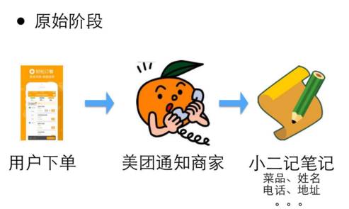 我们为了解放,首先我们解放我们自己,我们不给商家打电话了,我们给商家开发一个APP,每个商家只要安装了这个APP,他在手机上就可以接到通知。一旦有用户下单, APP上就会有通知说谁谁下了一个单,这时候老板根据APP上的信息,拿张纸,找个笔,把它写下来,然后给厨师。这个时候你会发现说,至少美团的同学们这个工作就省下来了。但是商家的工作,他虽然抄得准确一点,不用从电话里抄,直接从APP上抄,但是还是要做大量的工作,包括这个小纸条传来传去,有的人写得笔迹不是那么清楚。