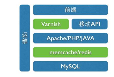 这就是一个最初期的架构,一个比较典型的LAMP架构,前端加上Apache/PHP,后端是MySQL,当然我们会有一些运维的工作在里面。可能大家如果自己写个网站的话,一开始都是这种架构,这种架构一开始也很好用。然后慢慢的,当业务量大了之后,我们发现整个系统的性能跟不上。那时候我们也只是做一些简单的优化就够了,比如说一开始我们是在前端,就是在Nginx和Apache之间加一些Varnish的缓存,然后在后端,我们可能用Memcached来减少MySQL的压力,这些都是缓存,整个架构还是没有太大的变化,还是一个优化了的LAMP架构。