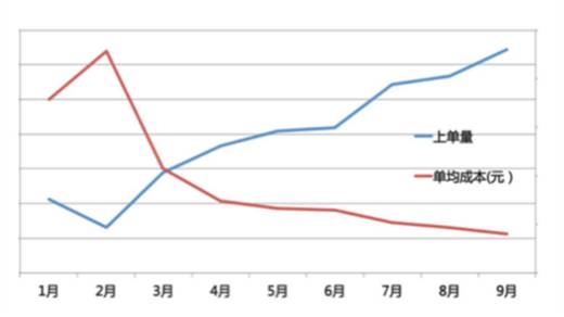 给大家看一下收益是什么呢?这是从今年1月份到9月份的一个数据,蓝线是我们每个月的上单量,从今年1月份,除了2月份,2月份因为是春节,整个的上单量有所下降,其余几个月份上单量一直是非常快速的往上涨的,一直到现在,每个月我们美团上的单子有40多万单不同的消费单,这种单子做一个假设,如果有一个吃喝玩乐的达人,他每天去吃一单美团的单子的,那40万单够他吃一千年。