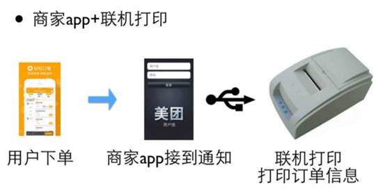 后来我们再进一步,我们APP接到一个打印机上,这个APP有可能是一个手机的APP,也有可能是电脑上的一个应用程序,这个APP连着打印机,一旦用户下单,打印机就会打出一个小条来,他拿这个小条,这个信息就非常准确了。商家不用花时间去写了,这时候就可以给厨师去做菜,厨师做完了交给配送员去送菜,这个就比较方便了。