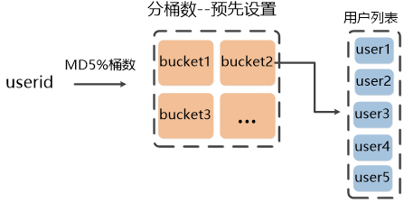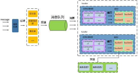 为提高信息的可读性,同时也降低下行压力,可将每10000人(具体每个桶的容量可以根据实际需求来调整,这里只举例)放一个桶,用户发送的消息,只在一个桶或者部分桶可见,用户按照桶的维度接收消息,这样一方面前端用户接收到的消息量会少很多(跟用户所处的桶的活跃度相关),并且一条消息也不用发送给所有用户,只发送给一个或者部分桶,以降低消息下行压力。