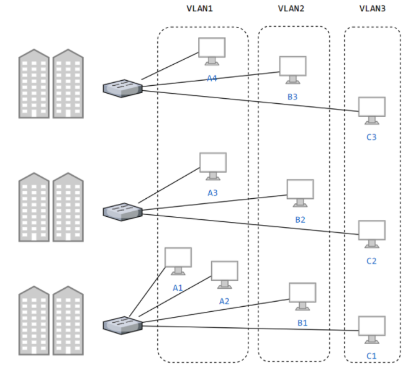 例如下图中 (A1, A2, A3, A4) 属于一个虚拟局域网,A1 发送的广播会被 A2、A3、A4 收到,而其它站点收不到。