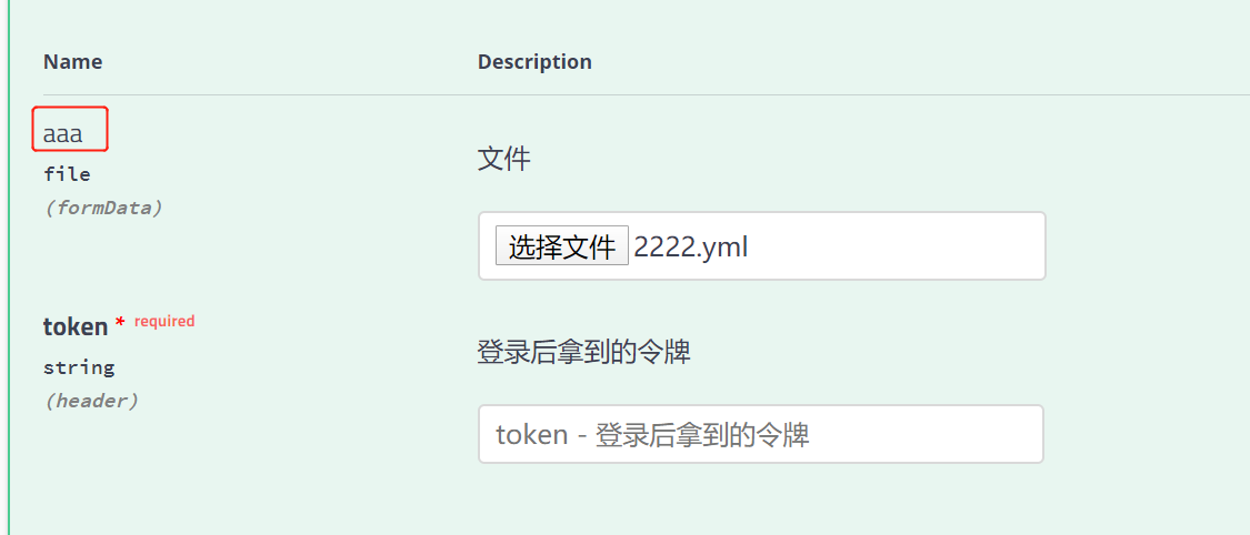 前端按照参数名字来设置 表单中文件组件的名字,当我修改参数名字之后,我改为aaa,如下