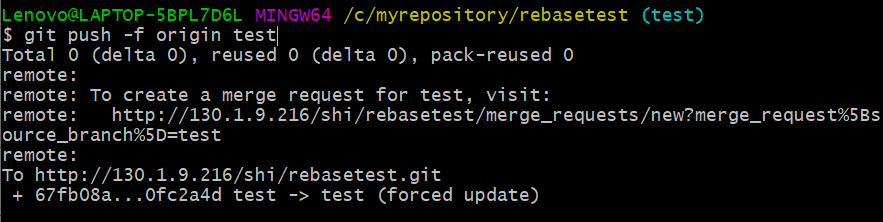 5、git push -f origin test 强制推送到远程分支,-f 强制,origin 远程仓库名,test 远程分支名