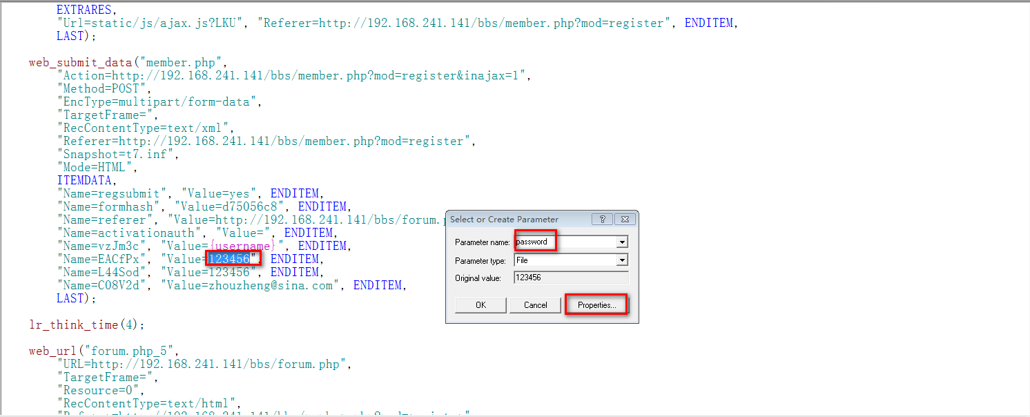web_submit_data("member.php", "Action=http://192.168.241.141/bbs/member.php?mod=register&inajax=1", "Method=POST", "EncType=multipart/form-data", "TargetFrame=", "RecContentType=text/xml", "Referer=http://192.168.241.141/bbs/member.php?mod=register", "Snapshot=t7.inf", "Mode=HTML", ITEMDATA, "Name=regsubmit", "Value=yes", ENDITEM, "Name=formhash", "Value=d75056c8", ENDITEM, "Name=referer", "Value=http://192.168.241.141/bbs/forum.php", ENDITEM, "Name=activationauth", "Value=", ENDITEM, "Name=vzJm3c", "Value=zhouzheng", ENDITEM, "Name=EACfPx", "Value=123456", ENDITEM, "Name=L44Sod", "Value=123456", ENDITEM, "Name=C08V2d", "Value=zhouzheng@sina.com", ENDITEM, LAST)