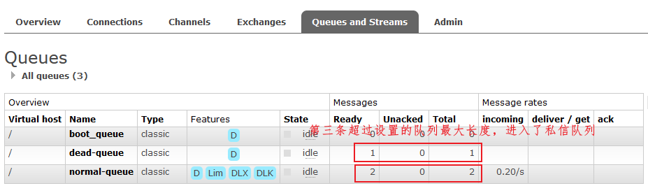 上面设置,队列中消息超过2个后,就会发送到死信队列,调用之前的生产者,发送三条消息到队列中