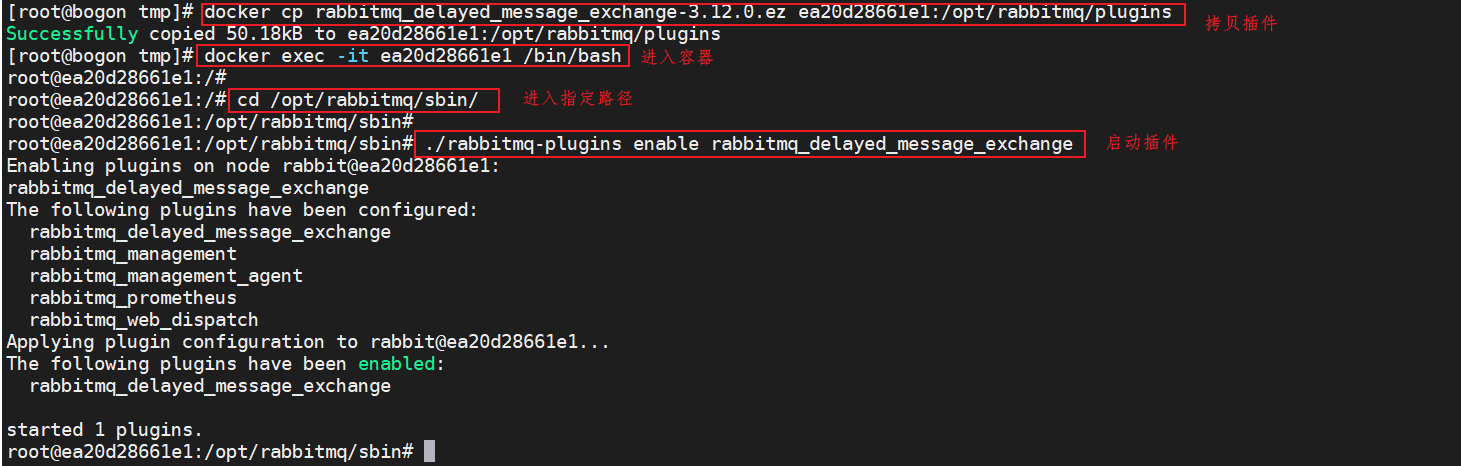 # 进入容器 docker exec -it 容器id或者名称 /bin/bash # 进入地址 cd /opt/rabbitmq/sbin # 启动延迟交换机插件 ./rabbitmq-plugins enable rabbitmq_delayed_message_exchange