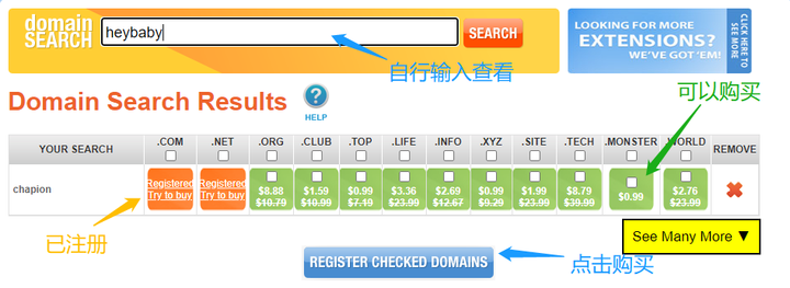 上面给出了你可以买哪些域名类型(类型有限)。选好后呢,看这里