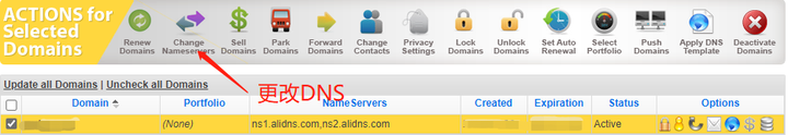 让你到你域名出生的地方去修改DNS服务器。这里有两个选项。cool!现在我们回来了上面断层的地方。打开你购买域名的网站,点击那个数字 1