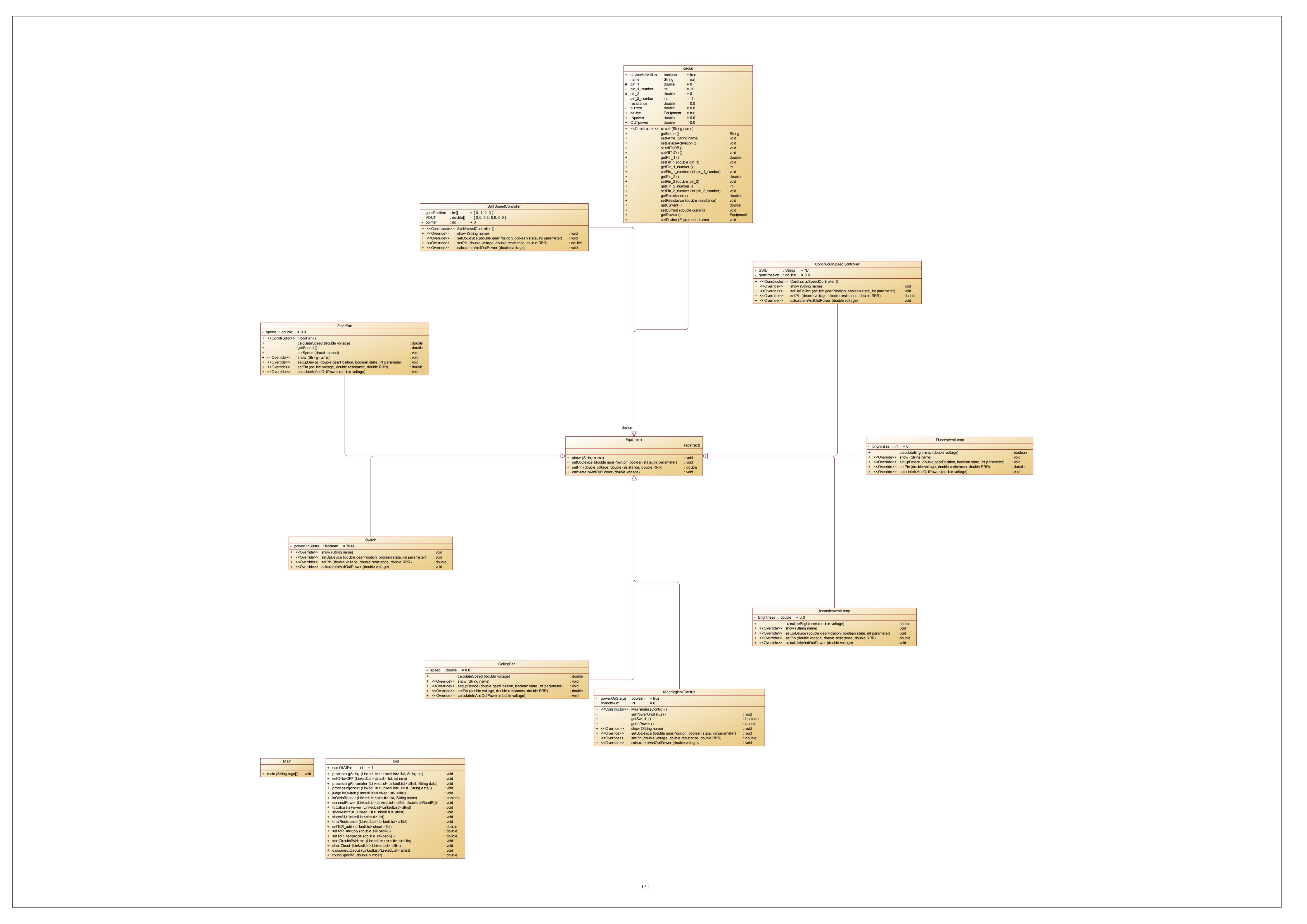 - 变Equipment类为abstract抽象类:加入抽象方法:更改引脚电压方法,设定元器件参数方法,计算设备属性方法,show方法等