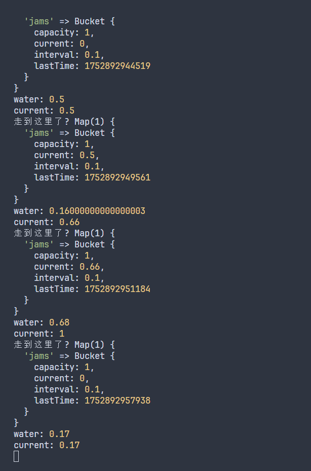 这里最关键的是理解capacity和interval字段的含义,capacity就是充当了阈值,而interval代表了“流速”(生成令牌的速度),比如一秒允许五次,那么0.8秒就生成了 5*0.8 = 4 个令牌,而current代表当前的令牌量(水桶中水的体积),