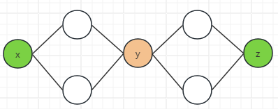 注意点双连通不具有传递性,比如\(x\)与\(y\)点双连通,\(y\)与\(z\)点双连通,\(x\)和\(z\)可能不点双连通。如下图: