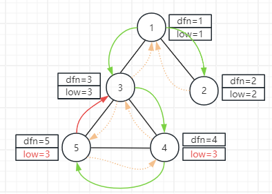如果\(low[v]=dfn[u]\),说明节点v通过另一条路径能回到节点u。正如本图,节点4可以通过4-5-3回到节点3,而非直接通过4-3回到节点3。