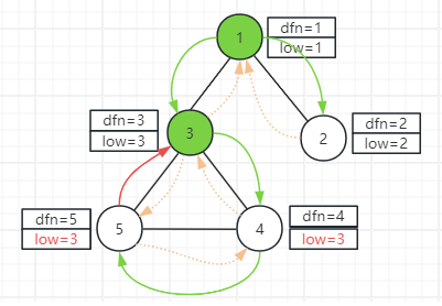 此时,由于\(dfn[3]=3<low[5]=5\),需要更新节点5的\(low[5]=dfn[3]\)。