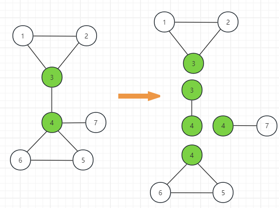 经过点双处理后,会形成四个点双连通分量,注意割点3和4的分布。