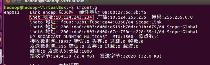 使用【ifconfig】命令查看当前Ubuntu的IP地址。