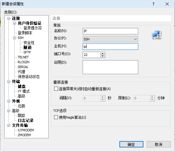 在xshell中新建会话,名称和主机都填IP地址。