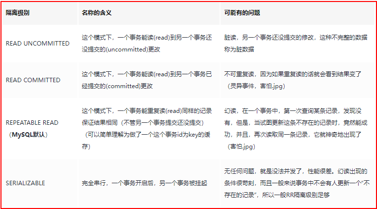| 读已提交 | 只能读取已提交的数据,避免脏读。 | 读取的都是已提交的数据,可能出现不可重复读。 |