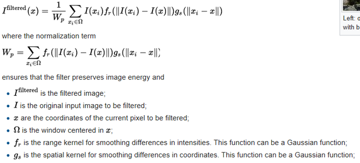 然后通过wiki百科和查到的一些paper,学习了一下双边滤波,它的表达式是