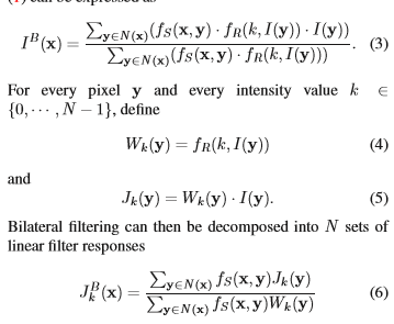 第九个式子的意思是说,对于某个固定的像素值k,双边滤波后的像素值可以看成是两个普通的卷积图像的比值。而这两个待卷积的图像都特别容易得到,注意一下的话,对于固定的k,他们都是点点操作的计算,这个实现起来效率会非常高。