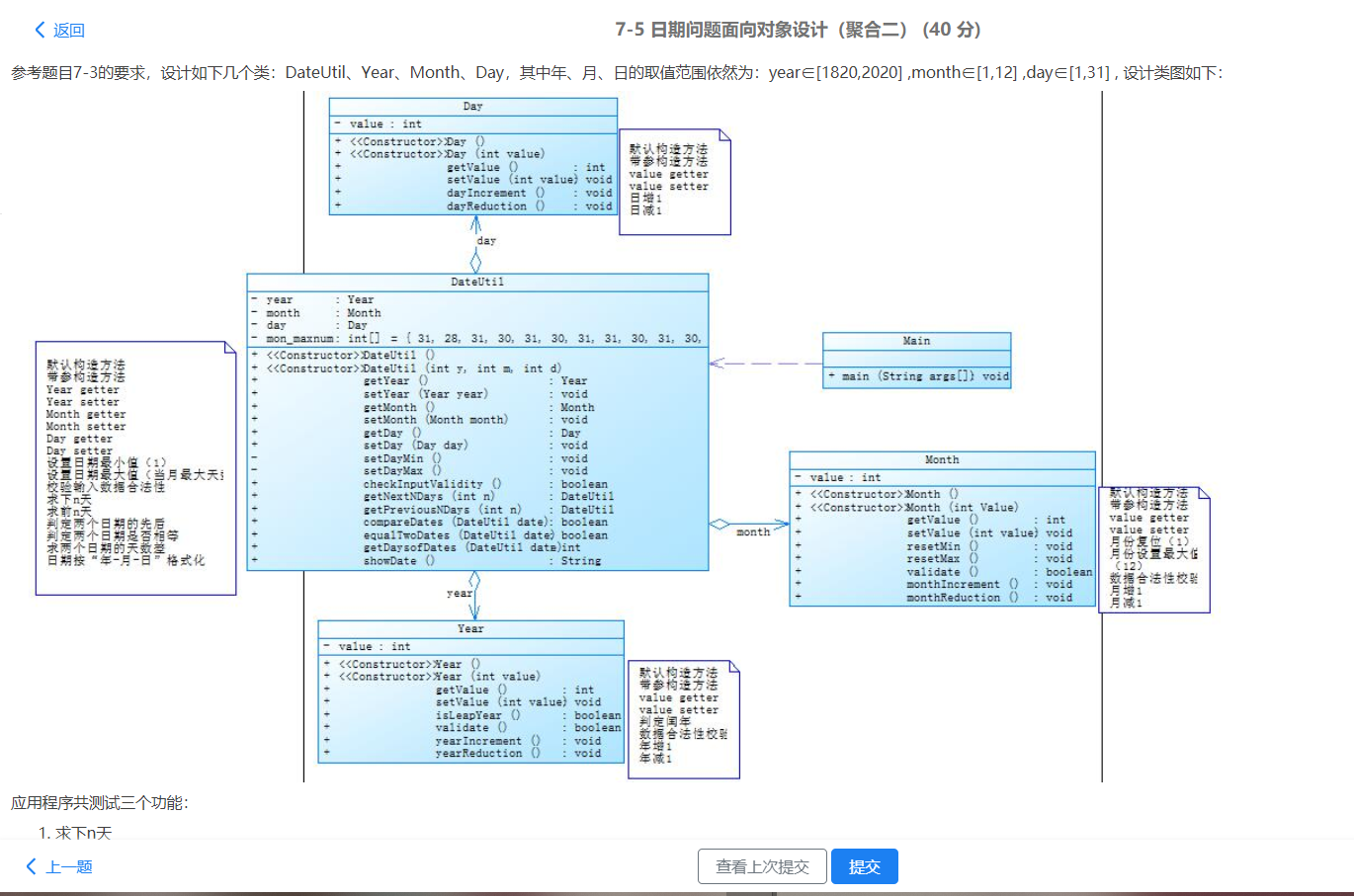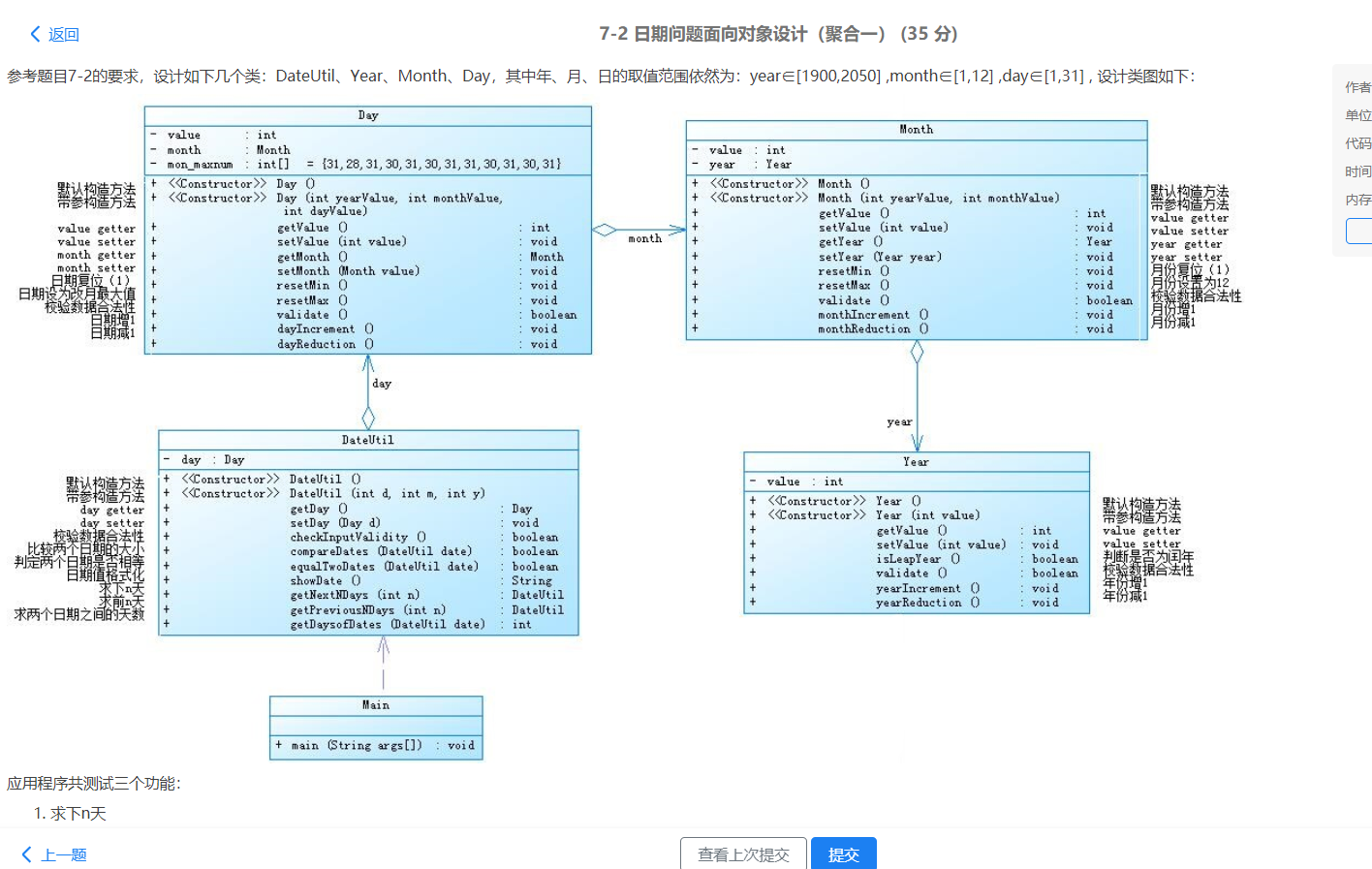 从类图分析就看的出来题集04-7-2的日期问题面向对象设计(聚合一)在聚合上采用的层层嵌套的模式Year类与Month类聚合;Month类与Day类聚合;Day类与DateUtil类聚合 Main类再依赖于DateUtil类这种方式设计会让类与类之间的关系更加紧密而且封装性也更强很多方法都在Main没有展示出来在其余的内部类自己解决了但是调用起来也会再某些方面更加的繁杂以及对于参数的传递也会更加的复杂做很多没有必要的重复传参而且在类图上可以看到基本上就每一个类都有get set 无形增加了复杂度