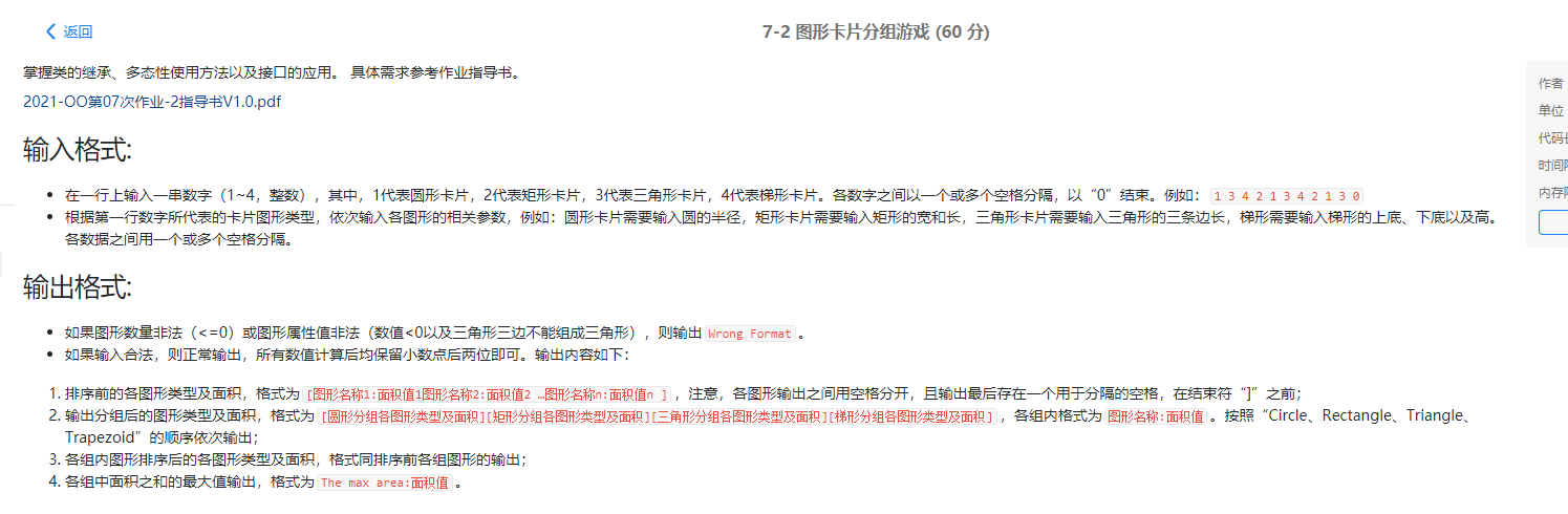 沿袭作业 7-1,本次作业主要对卡片(Card)进行分组游戏,其规则为随机发放一些卡片给学生, 卡片仍然分为四种形状:圆形(Circle)、矩形(Rectangle)、三角形(Triangle)及梯形(Trapezoid), 并给出各种卡片的相应参数,要求学生首先根据卡片类型将所有卡片进行分组(一个类型分为一组, 所以最多四组),然后能够对每组内的卡片根据面积值从大到小进行排序,同时求出该组内所有卡片 的面积之和,最后求出每组卡片面积之和中的最大值。输出分组后的图形类型及面积,格式为“[圆形分组各图形类型及面积][矩形分组各图形类型 及面积][三角形分组各图形类型及面积][梯形分组各图形类型及面积]”,各组内格式为“图形 名称:面积值”。按照“Circle、Rectangle、Triangle、Trapezoid”的顺序依次输出; ➢ 各组内图形排序后的各图形类型及面积,格式同排序前各组图形的输出; ➢ 各组中面积之和的最大值输出,格式为“The max area:面积值”