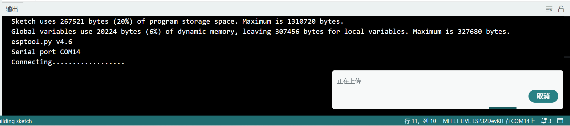 2)另一种方式是仅在IDE完成编译、显示“connecting...”信息时才按一下BOOT键(注意不要过快,如按下保持2~3秒再松开),实测也可进行程序下载进行。下载完成后,需要手动完成单片机复位,单片机才开始执行新程序。