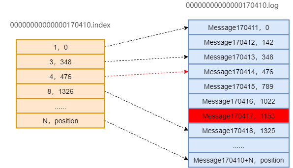 - 首先用二分查找确定它是在哪个Segment文件中,其中0000000000000000000.index为最开始的文件,第二个文件为0000000000000170410.index(起始偏移为170410+1 = 170411),而第三个文件为0000000000000239430.index(起始偏移为239430+1 = 239431)。所以这个offset = 170417就落在第二个文件中。其他后续文件可以依此类推,以起始偏移量命名并排列这些文件,然后根据二分查找法就可以快速定位到具体文件位置。