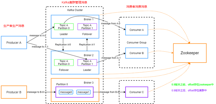 - kafka可以保证分区消息的顺序。如果使用同一个生产者往同一个分区写入消息,而且消息B在消息A之后写入,那么kafka可以保证消息B的偏移量比消息A的偏移量大,而且消费者会先读取到消息A再读取消息B。