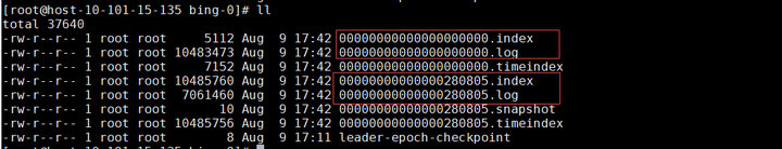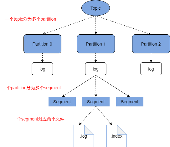 由于生产者生产的消息会不断追加到log文件末尾,为防止log文件过大导致数据定位效率低下,Kafka采取了分片和索引的机制,将每个partition分为多个segment。(由log.segment.bytes决定,控制每个segment的大小,也可通过log.segment.ms控制,指定多长时间后日志片段会被关闭)每个segment对应两个文件——“.index”文件和“.log”文件。这些文件位于一个文件夹下,该文件夹的命名规则为:topic名称+分区序号。例如:bing这个topic有3个分区,则其对应的文件夹为:bing-0、bing-1和bing-2。