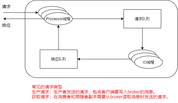 broker如何处理请求:broker会在它所监听的每个端口上运行一个Acceptor线程,这个线程会创建一个连接并把它交给Processor线程去处理。Processor线程(也叫网络线程)的数量是可配的,Processor线程负责从客户端获取请求信息,把它们放进请求队列,然后从响应队列获取响应信息,并发送给客户端。如下图所示: