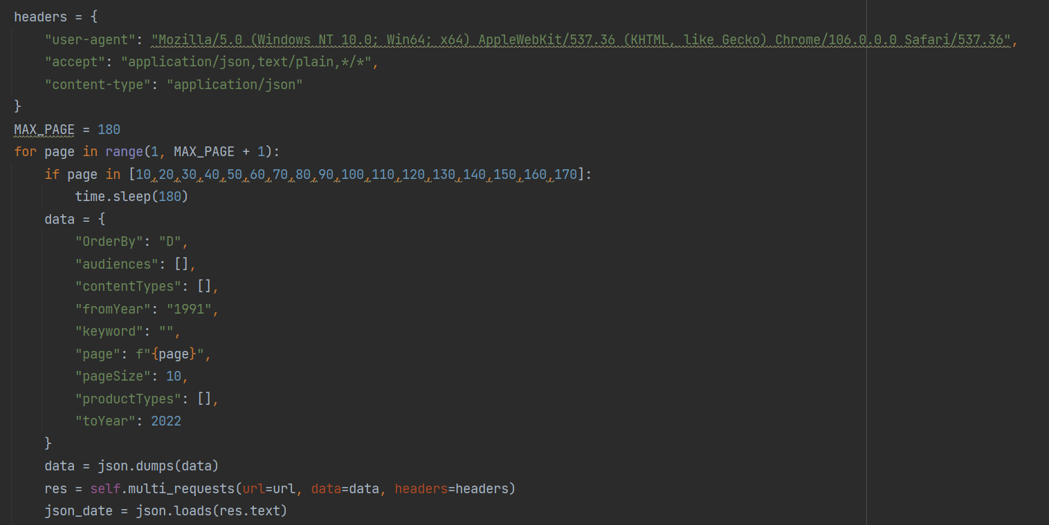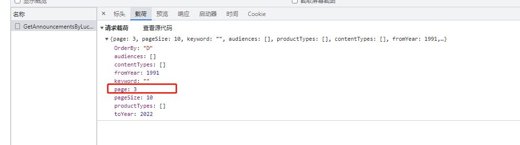 这时候就需要在post请求的data参数加上载荷,可以发现载荷里面有page这个参数,并且与我们翻页对应