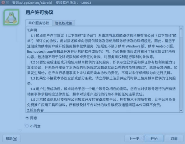 3、在弹出的“用户许可协议”页中,选中“同意”选项,然后点击“开始”按钮进入安装页。