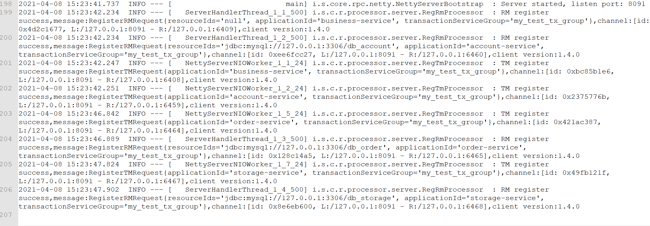 启动项目后, 可见项目会注册到seata服务器,日志如下