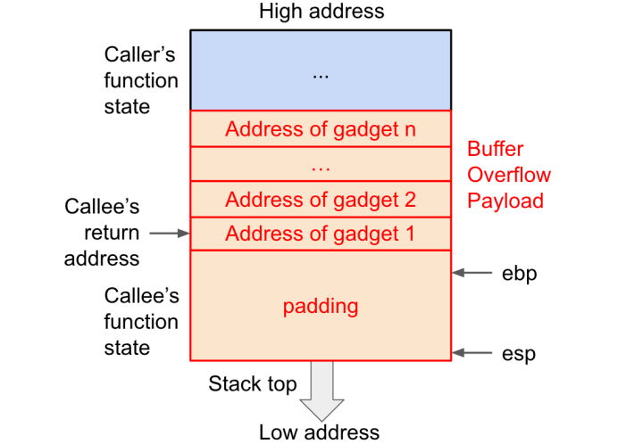 - 修改返回地址,让其指向内存中已有的一段指令(ROP)