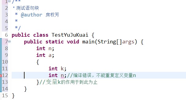 语句块·(又是叫复合语句),是用花括号括起的任意数量的简单Java语句。块确定了局部变量的作用域,块中的程序代码,作为一个整体,是要被一起执行的。块可以被嵌套在另一个块中,但是不能在两个嵌套的块内声明同名的变量。语句块可以使用外部的变量,而外部不能使用语句块中定义的变量,因为语句块中定义的变量作用域只限于语句块。