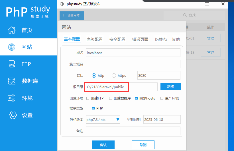 l 打开phpstudy定义一个网站,设置网站根目录为laravel框架下的public目录