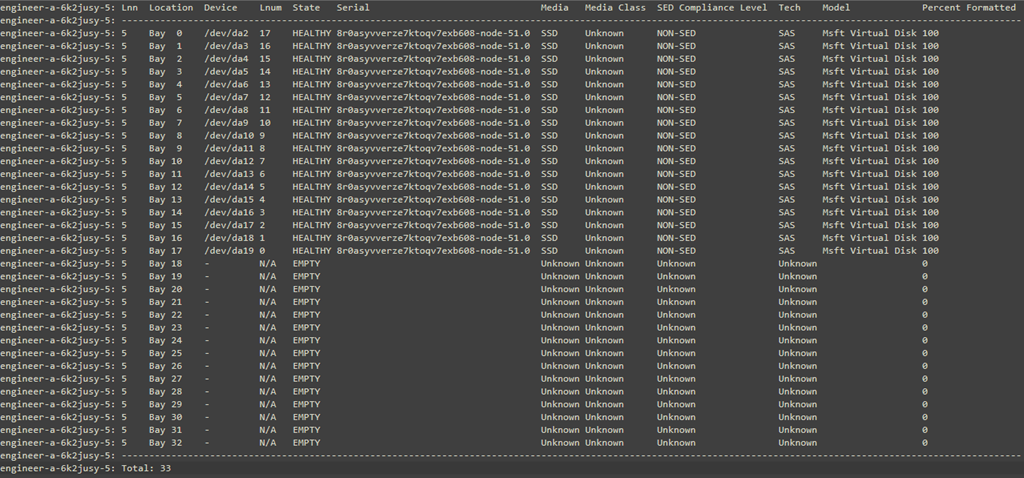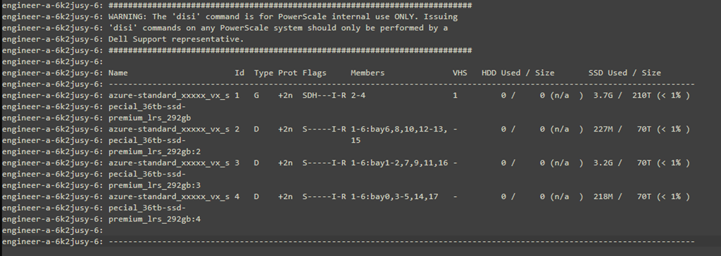 从这个日志片段中,可以看到是210TB。而且,这个cluster是一个disk pool group, 这个group里有三个disk pool,每个pool是70TB。那么,210TB,共计18 * 6 = 108块盘,那么单块盘就是1.94TB。