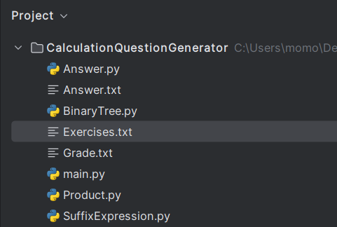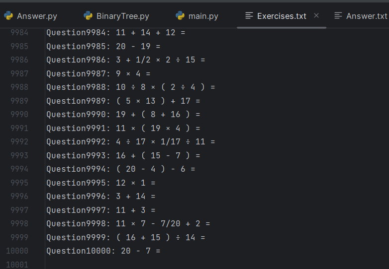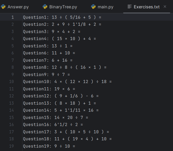 · 生成的题目存入执行程序的当前目录下的Exercises.txt文件