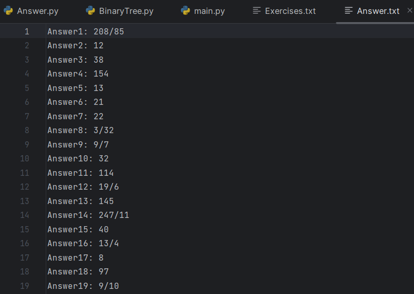 读取表达式列表中的每个表达式,计算其结果,并将结果以"AnswerX: Y"的格式写入文件"Answer.txt"中,其中X表示表达式的序号,Y表示表达式的计算结果。
