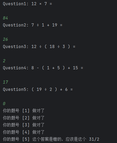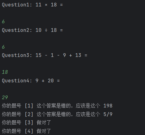 对于生成4条题目,用户输入答案以及计算机判断正误的运行结果如下