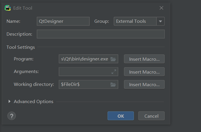 File->setting->Tools->External Too;s 点击+ 号,名称和描述都自己定义,program项目填入designer.exe所在文件夹,这个一般不好找