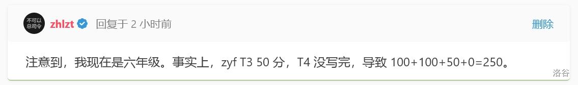 而且 lzt 还在犇犇里发"zyf 年仅初一便差点场切 T4",但是 zyf 没写游记,反正我个人认为是写了 \(O(Tn\log n)\) 拿了 \(100+100+100+[76,100]=[376,400]\)